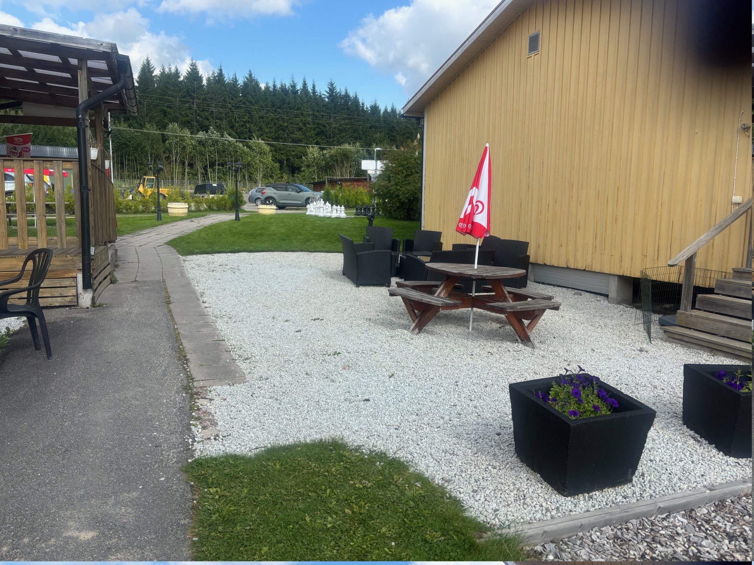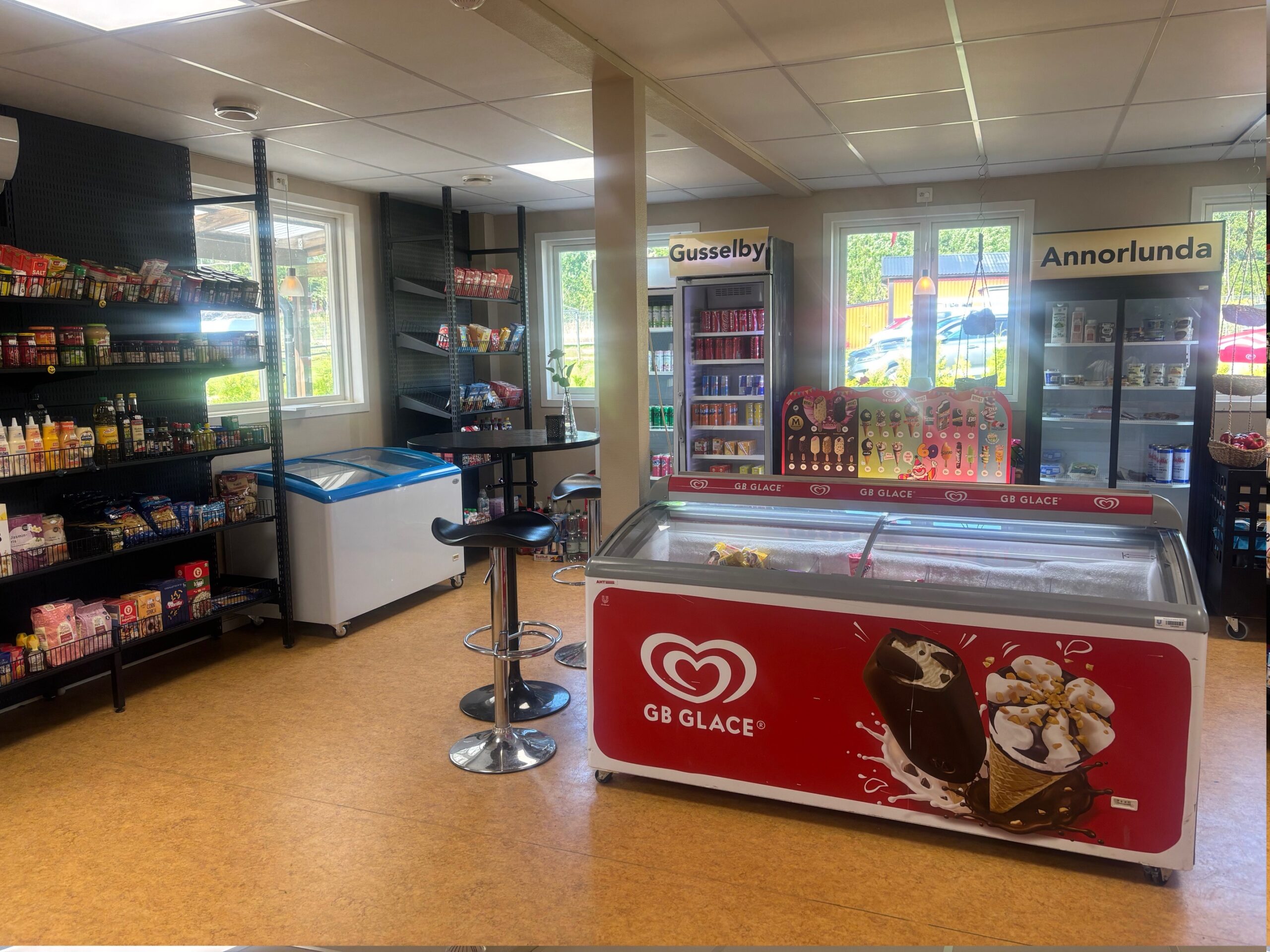 Det finns ett minilivs som servar dig med basvaror. Där kan du också stanna för en kopp kaffe med dopp. Vårt minilivs erbjuder även lite enklare mat.