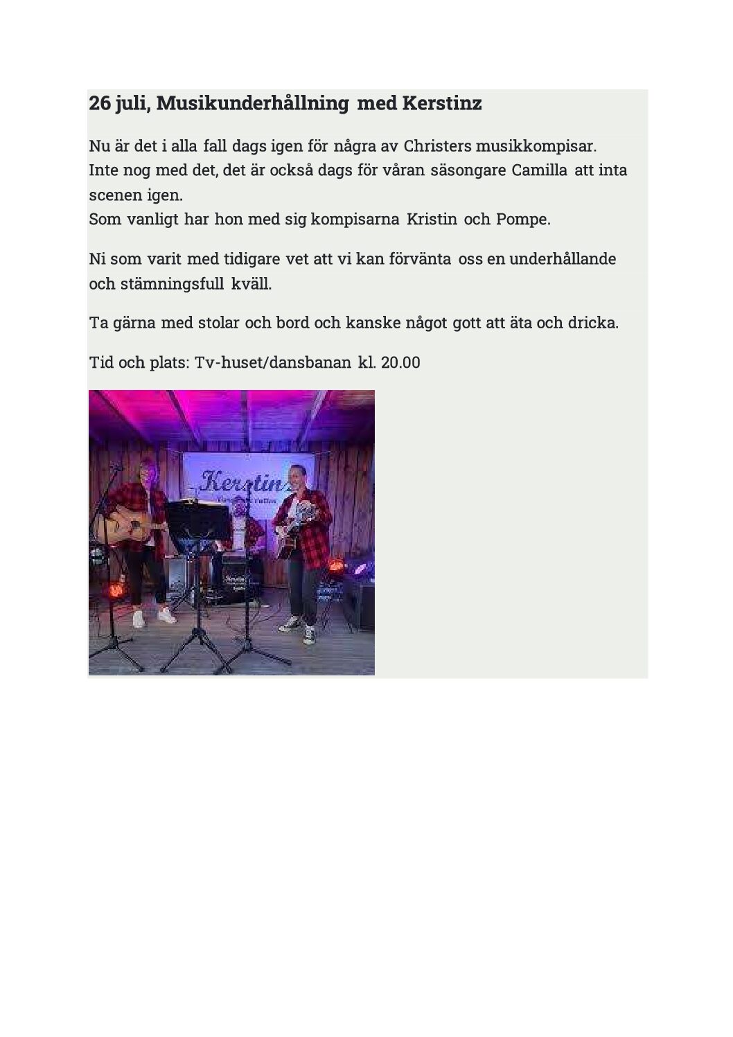 jul 26 20:00 - 23:30 Musikunderhållning med Kerstinz Caravan Club Sollerön Soldvägen 149, Levsnäs Event Details Get Directions