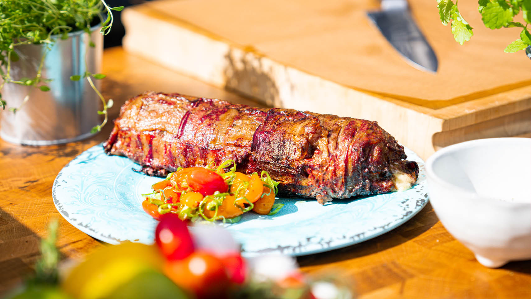 Baconlindad nötfärslimpa med rökt tomatsallad