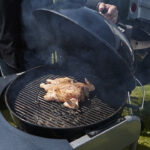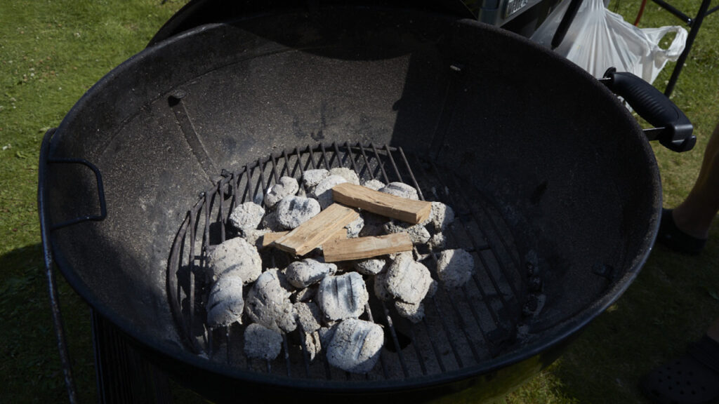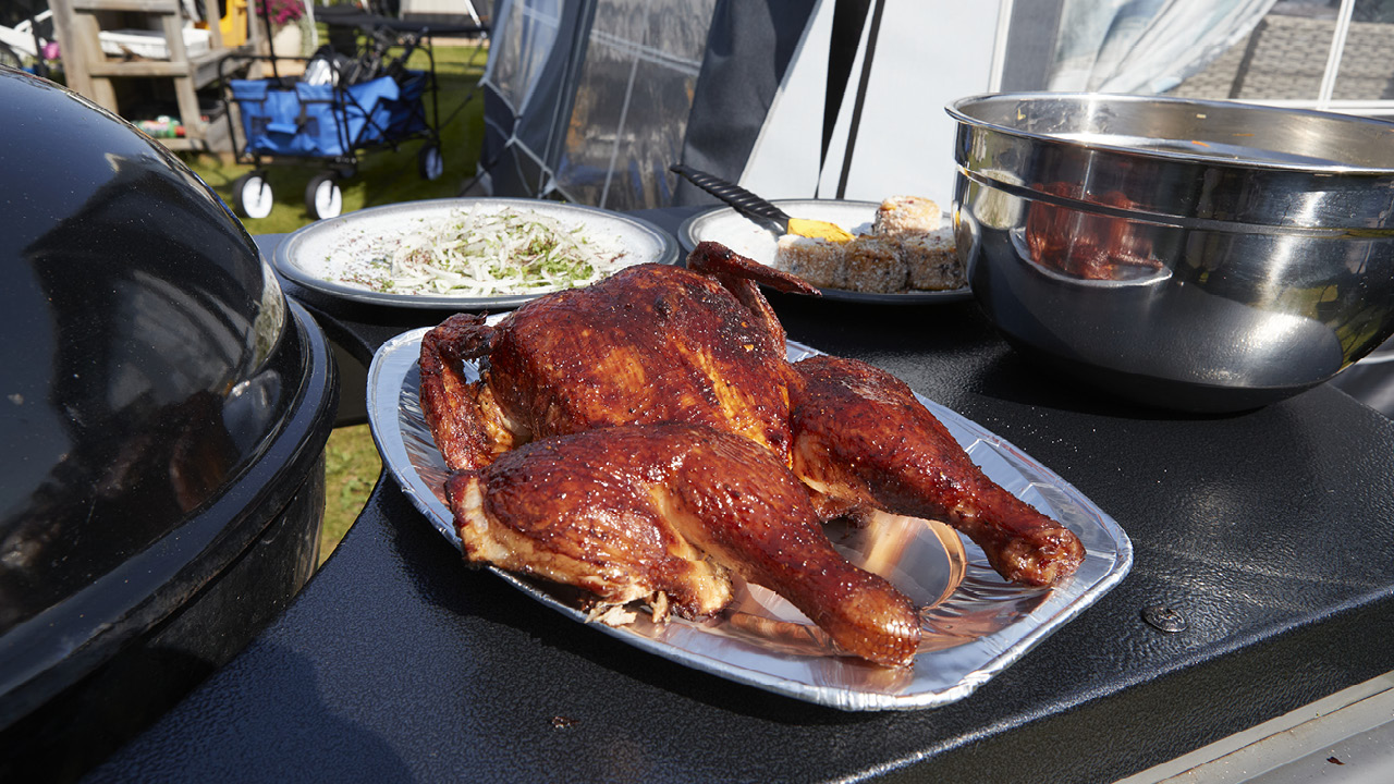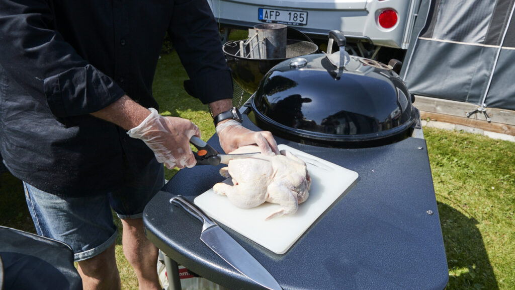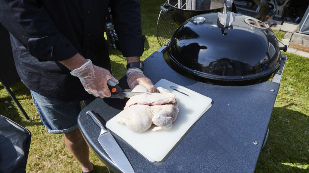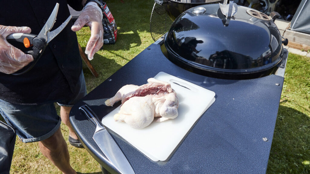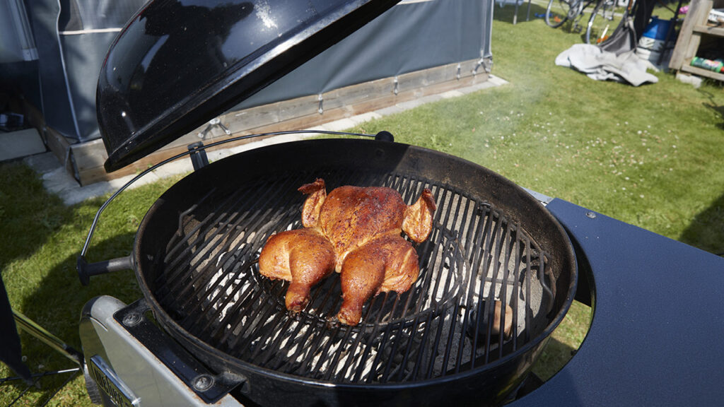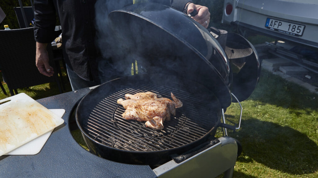 - Kycklingen ska tillagas indirekt i klotgrill med glöden på sidorna av grillen och kycklingen i mitten.