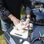 - Klipp bort ryggbenet och vik upp kycklingen så den blir stor och platt. Genom att göra så kortas tillagningstiden med hälften.