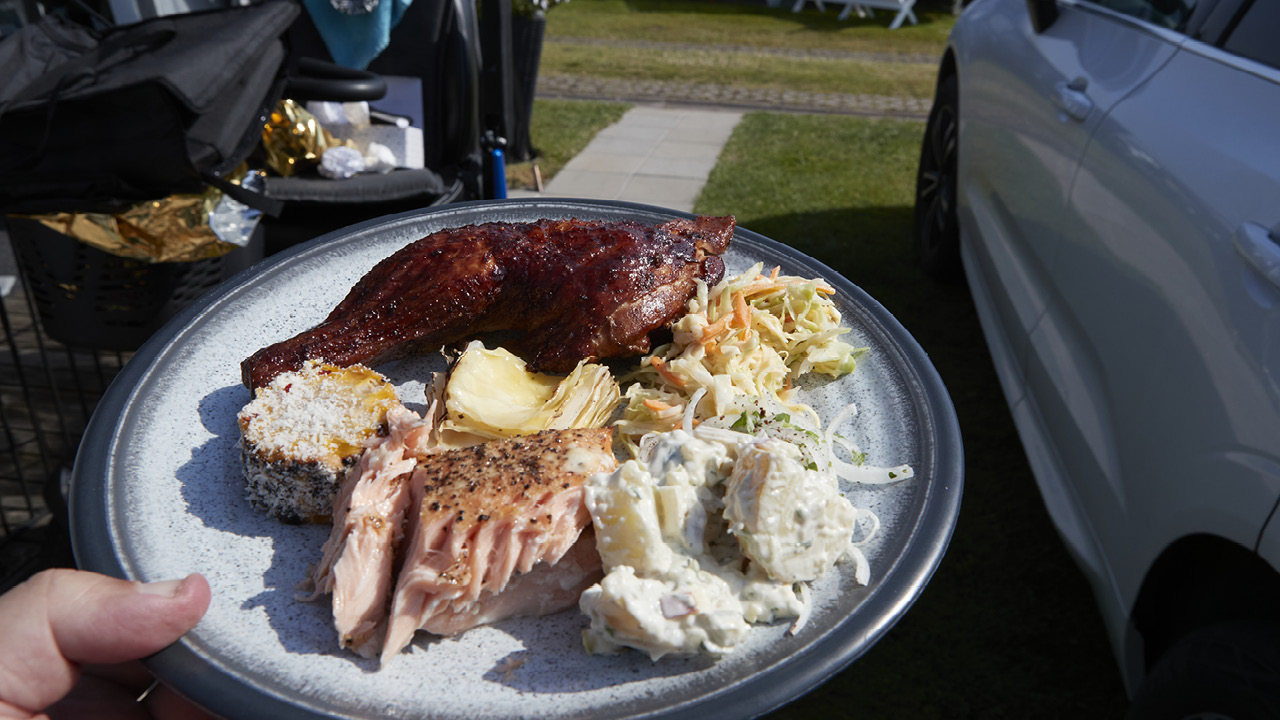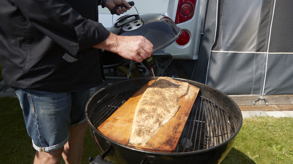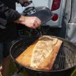 • Lägg plankan med laxen på grillen och sätt på locket.