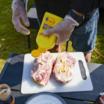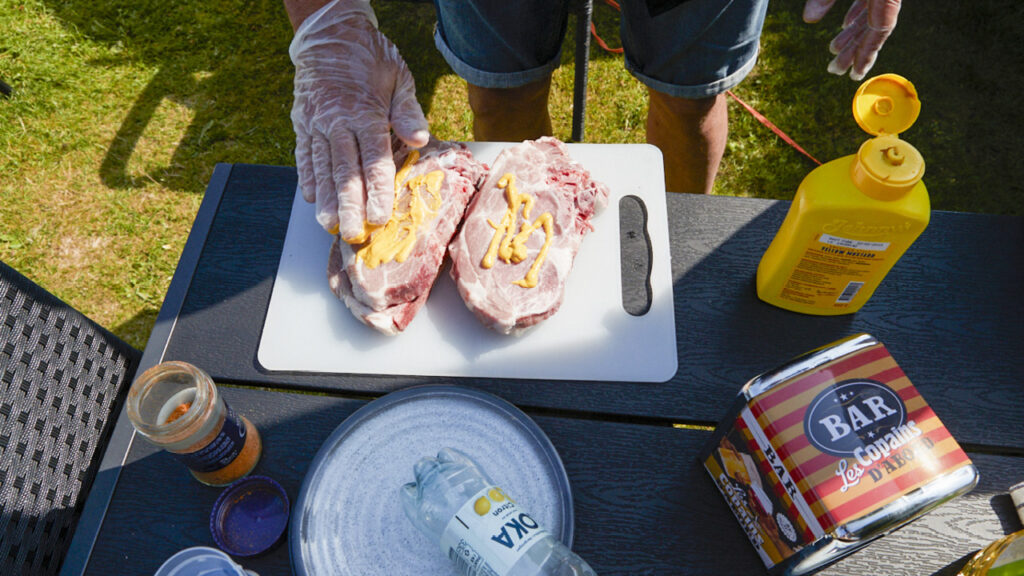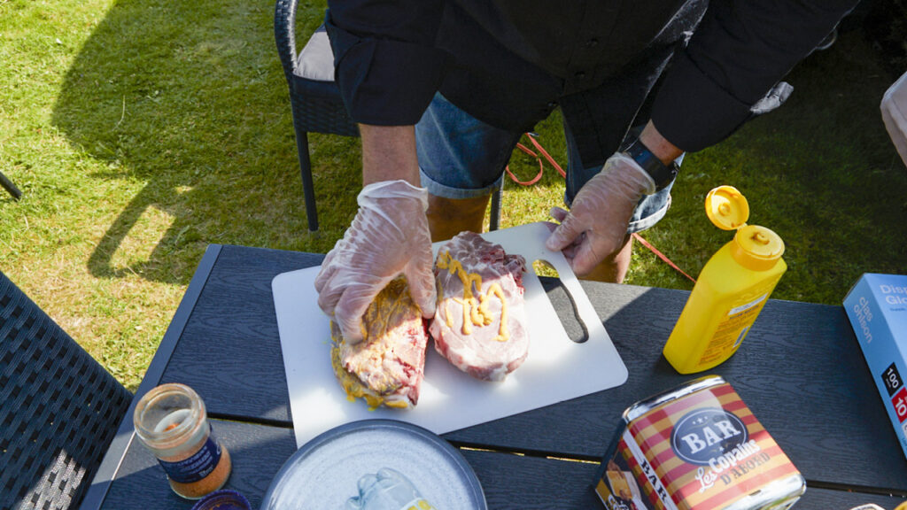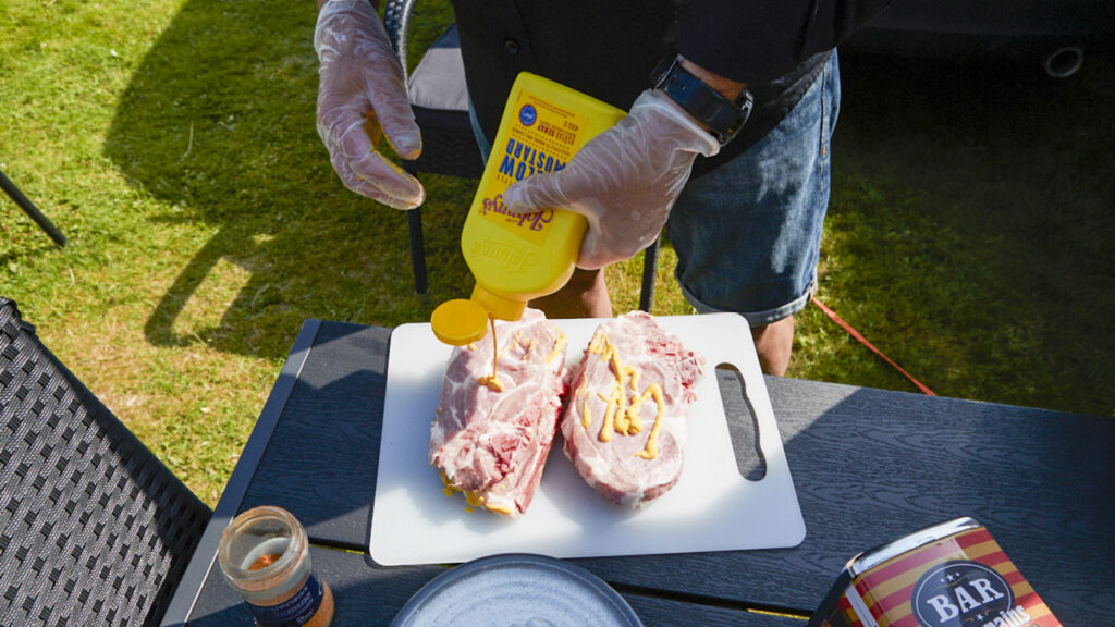 • Pensla rikligt med senap runt om köttbitarna.