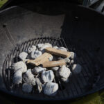 • Lägg gallret ovanpå som vanligt. Plankan med laxen placeras sedan på gallret. Håll avståndet 15 cm från glöd till plankan.