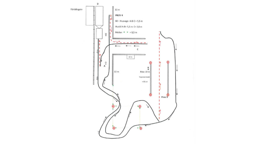 Banan för manöverkörning är alltid densamma men finns för både husvagn och husbil. Den är framtagen av teknikkommittén och innehåller flera moment som den med ett fritidsfordon kan stöta på och behöver klara av. Starten går vid ett fingerat förtält och föraren får därefter testa på att köra slalom mellan konor, testa rakbackning och vända vid ett gathörn.