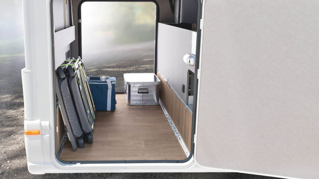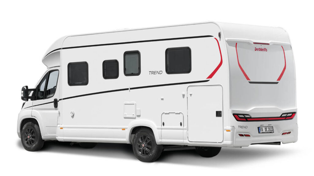 Garaget längst bak har dörrar som enkelt kan öppnas med en hand. Ramen är nedsänkt bakom bakaxeln vilket gör det enklare att lasta. Här finns fri höjd på upp till 110 centimeter. Nya Dethleffs Trend byggs på Fiat Ducato med 140 hästar stark dieselmotor med avgasklass Euro 6d Final. Som tillval finns en version med 180 hästkrafter. Nya Dethleffs Trend hade premiär på CMT-mässan i Stuttgart 13–21 januari.