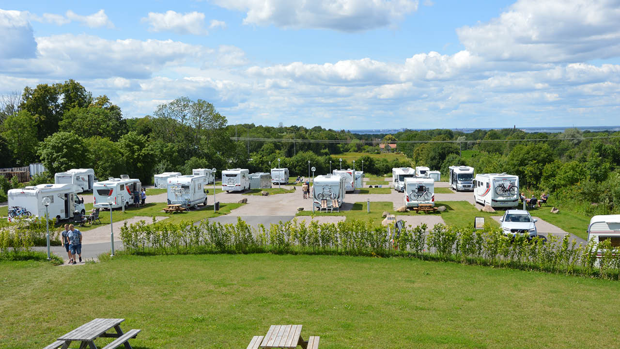 Den nyanlagda ställplatsen välkomnar både husvagnar och husbilar och uppställningsplatserna är gjorda i terrasser där man parkerar på grus men har en grön gräsmatta utanför dörren.