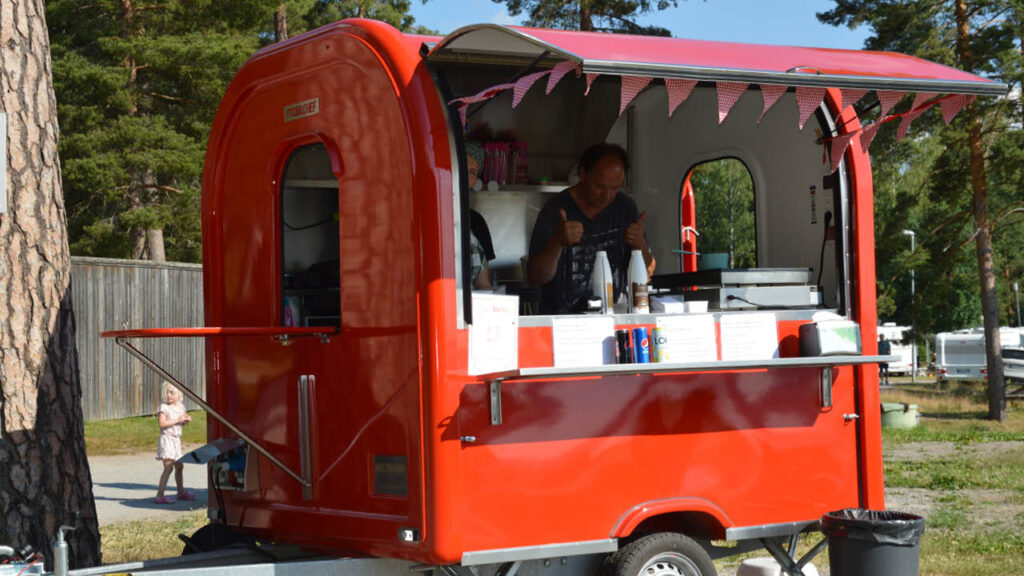 Campingbutiken finns i receptionshuset och erbjuder förutom mat och morgonbröd även rikligt med Sverigesouvenirer.