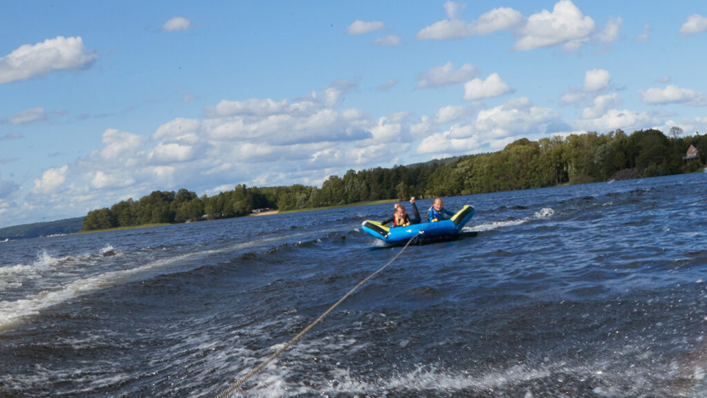 Det går att roa sig även med andra vattenaktiviteter i Skånes största sjö Ivösjön. Emmie och Kasper Pihl åker även gärna det de kallar för ”plattan” efter motorbåten. På den kan man sitta flera stycken.
