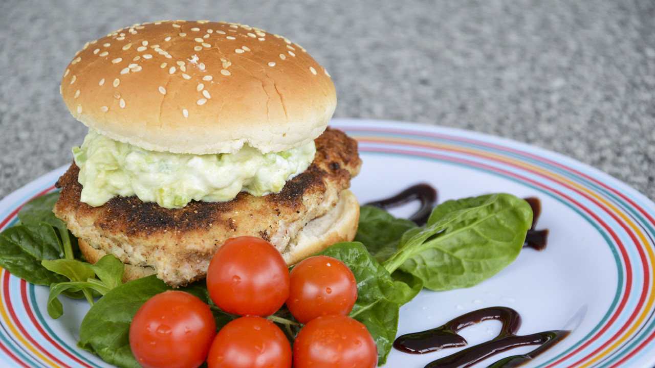 Blanda kycklingfärsen med osten och kryddor, forma med lite oljiga händer smeten till fyra burgare som läggs på ett fat med ströbröd. Strö även ströbröd ovanpå.