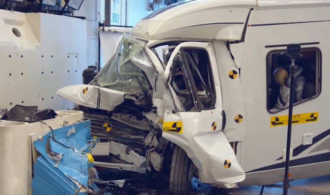 Trafikverkets krocktester är samma frontalkollisionstest som används i Euro NCAP, en europeisk konsumentorganisation som krocktestar personbilar; en frontalkollision i 64 km/h mot en barriär som motsvarar ett fordon med samma vikt. Även om husbilarna var olastade vid tillfället så är de relativt tunga.
