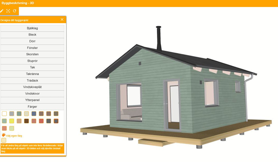 Branschorganisationen Svenskt Träs kostnadsfria byggbeskrivningar får ny funktion. Nu blir det möjligt att ändra färg, paneltyp och takmaterial i alla 28 utvändiga byggbeskrivningar på byggbeskrivningar.se. Byggprojekten blir mer verklighetstrogna och kan anpassas efter eget tycke och smak.