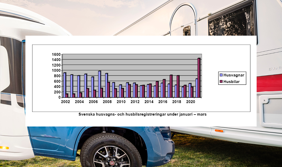 Husbilsförsäljningen ökade med nära 280 procent! En stor del av dessa husbilar registrerades antagligen för att slippa undan den kraftiga skattehöjningen den 1 april. Husvagnsförsäljningen steg med nära 35 procent, men även där finns det felkällor i statistiken.