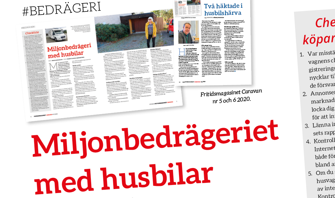 Camping är hett! Allt fler vill köpa husvagnar och husbilar. Stor efterfrågan lockar också människor som inte har ärliga avsikter. Både köpare och säljare kan råka illa ut – speciellt vid privat försäljning. I vinter åtalades två personer på Berggrens Husbils Center i Lagan för den här typen av bedrägerier. I nästa nummer av Fritidsmagasinet Caravan finns tips för både säljare och köpare av fritidsfordon.
